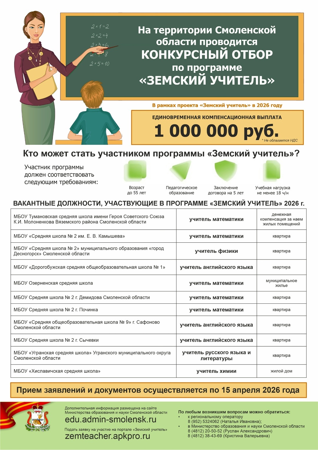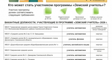 Министерством образования и науки Смоленской области (далее – Министерство) объявлен конкурсный отбор претендентов на право получения единовременной компенсационной выплаты учителям, прибывшим (переехавшим) на работу в сельские населенные пункты, либо рабочие поселки, либо поселки городского типа, либо города с населением до 50 тысяч в рамках областной государственной программы «Развитие образования в Смоленской области» (далее – программа «Земский учитель»).