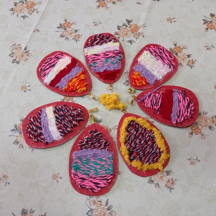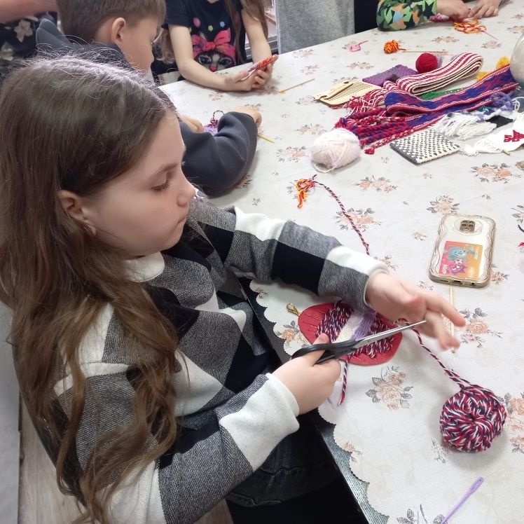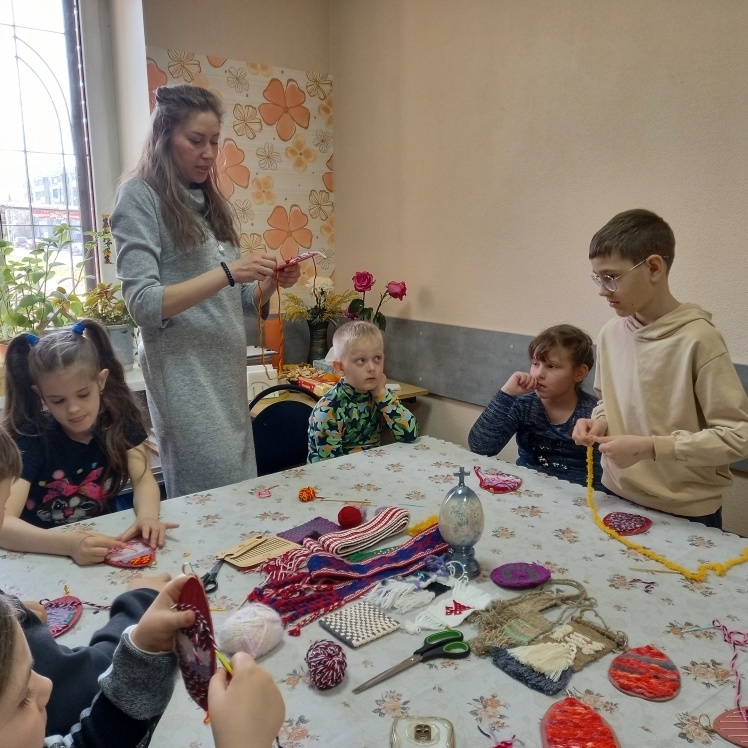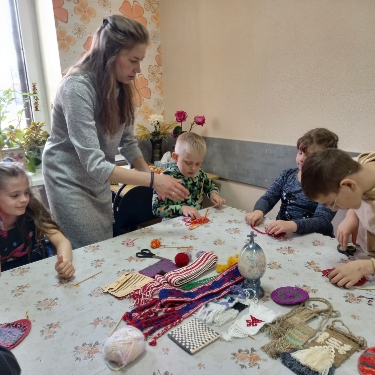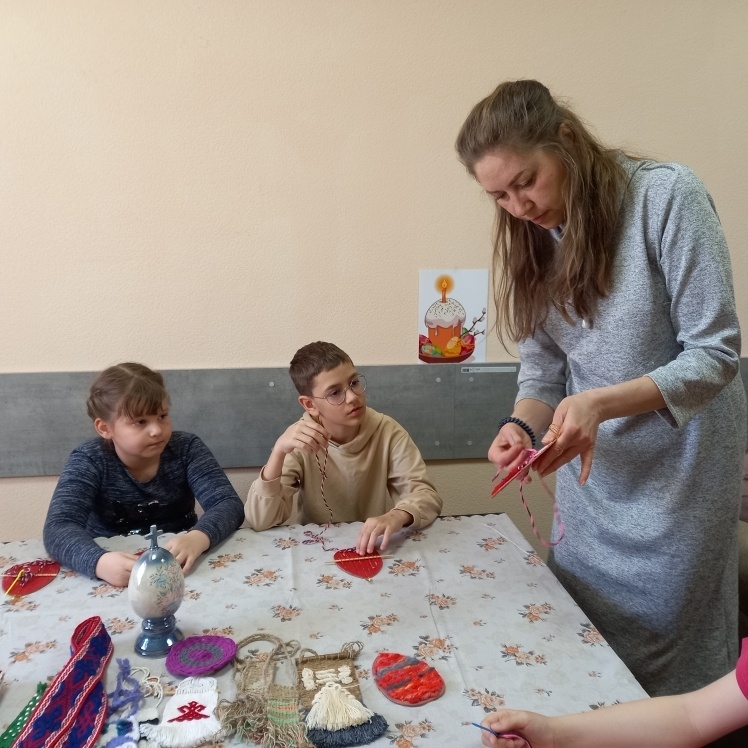 Мастер-класс в технике ткачества провела Ольга Минченкова, известная мастерица. Ребята с восхищением рассматривали выполненные ею тканные пояса, украшения, а затем после знакомства с техникой плетения получили заготовки в форме яйца и начали его оформление.