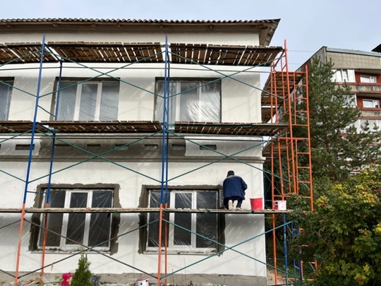 Фасад ДДТ полностью подготовлен к дальнейшей отделке: стены отштукатурены и загрунтованы, что создаёт идеальную основу для предстоящей покраски. Это позволит обновить и освежить внешний облик здания, сделав его более привлекательным и современным.