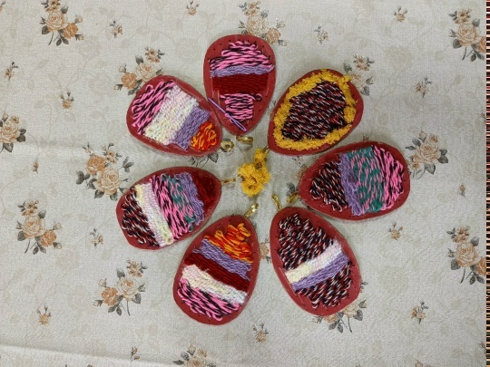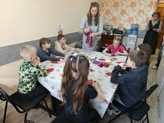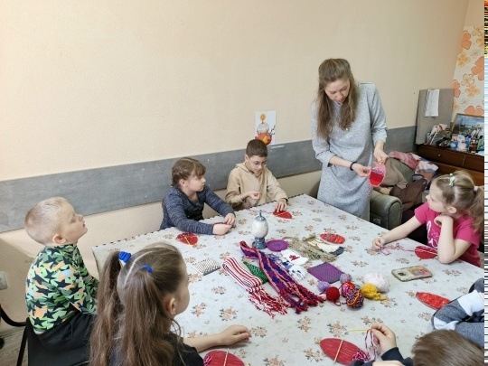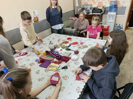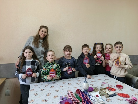 Ребята под руководством опытной мастерицы Ольги Минченковой учились выполнять пасхальное яйцо в технике ткачества.